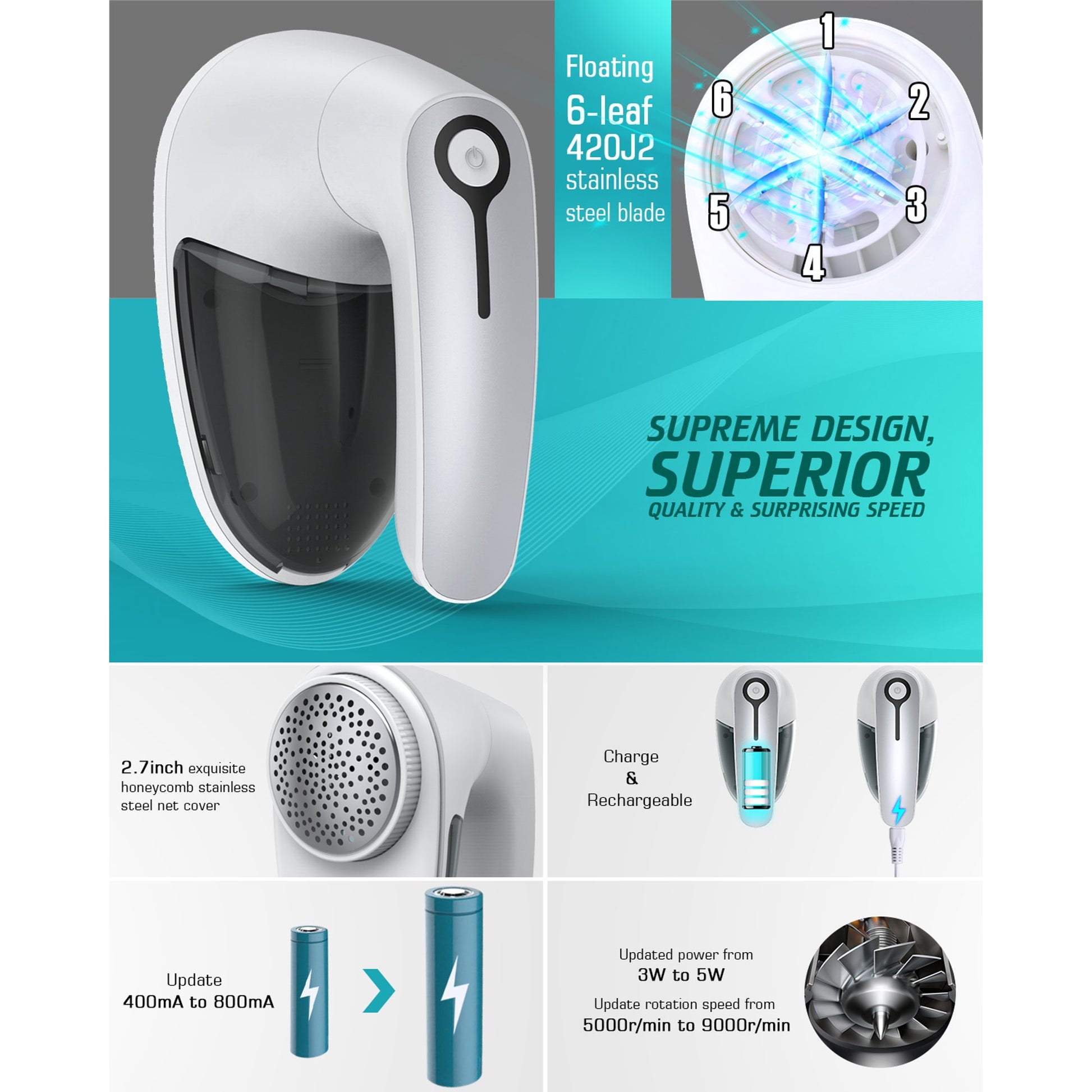 【High Hardness Blades & Elastic Mesh】Rotatable lengthened 30% 6-leaf 420J2 HIGH HARDNESS stainless steel blades float up and down automatically so as to avoid breaking and jamming, trimming fabric fuzz faster by 60% without damaging clothes. 2.7inch bionic honeycomb anti-abrasive stainless steel mesh increases coverage by 50%, adapts to the uneven surface automatically, capturing all size of lint precisely in a large area.